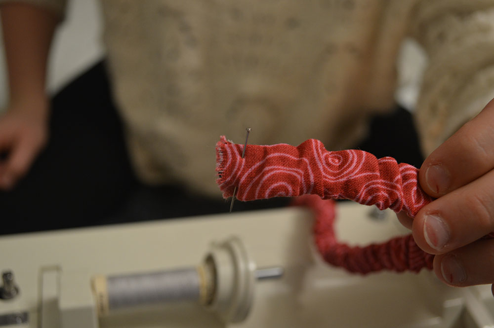 - Take a hook tool, push it through the fabric tube, and thread the elastic through. “I use an old clothes hanger, but maybe there are more professional tools out there,” Mooney said.