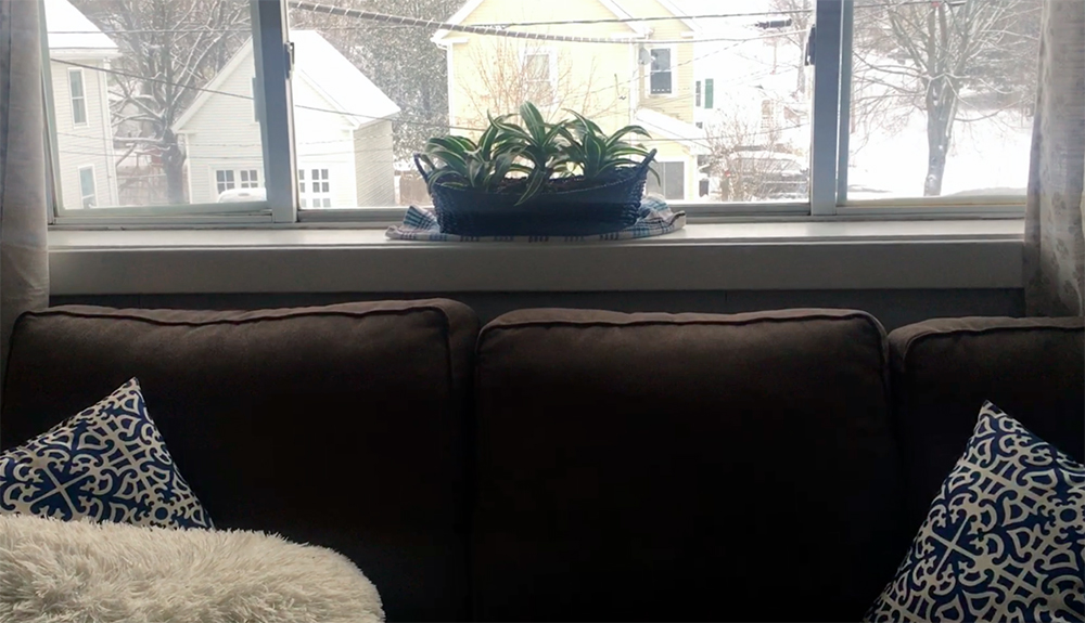 Still, the colorful planter looked lovely on the windowsill behind my couch. I placed a dish towel underneath to catch the water for now, but I plan on purchasing (or maybe crafting) some sort of saucer to catch water in the long term.